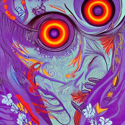 a painting of an eye with purple and orange flowers, in the style of james jean, mysterious jungle, martin ansin, 32k uhd, papua new guinea art, light blue and red, poster --ar 37:61 --stylize 750 --v 6