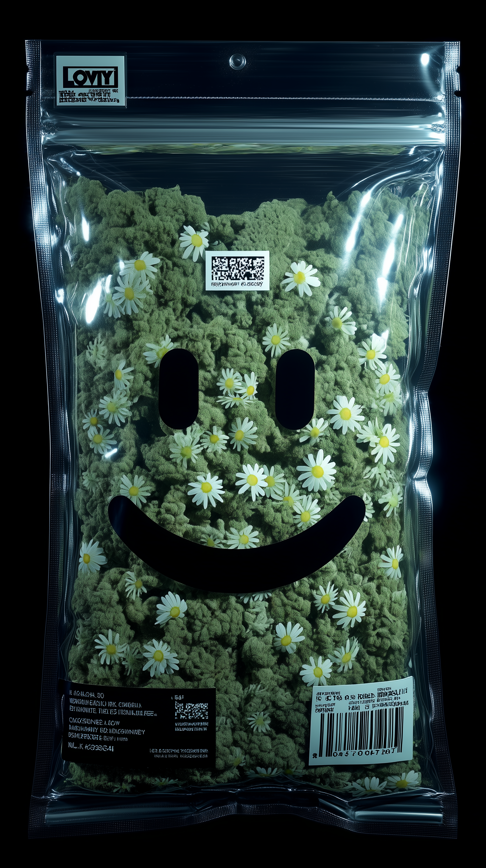 high-quality product photography of weed tightly packed in a transparent rectangular vacuum bag, the package has a silver metallized sheen, the texture of the packaging creates the effect of a membrane tightly fitting the smileys with many folds and bends, perfectly conforming to their shape, which are significantly deformed by vacuum, stylish black barcodes and stickers, a white technological minimalist sticker with high-quality black "Lovify" lettering, and an additional stylish barcode, y2k style, extreme detail and realistic textures, professional lighting, photographed by Steven Klein, using a Pentax 645Z camera with an FA 120mm f/4 Macro lens, completely black background, contemporary and stylish composition