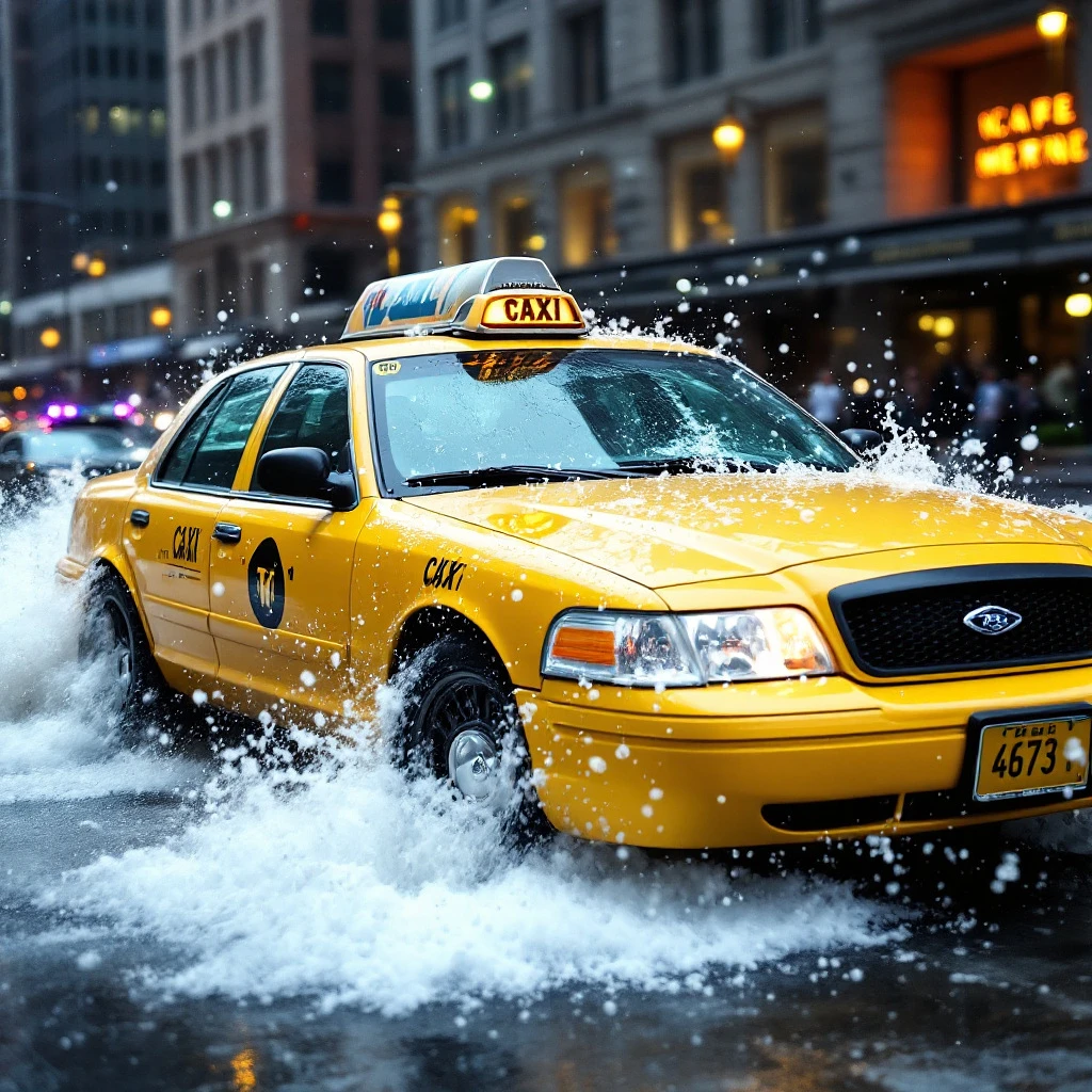 a yellow cab car driving throw the water, cool, gowing, --ar, 7v 8;75fgt . 5qtsjgckba----fwr