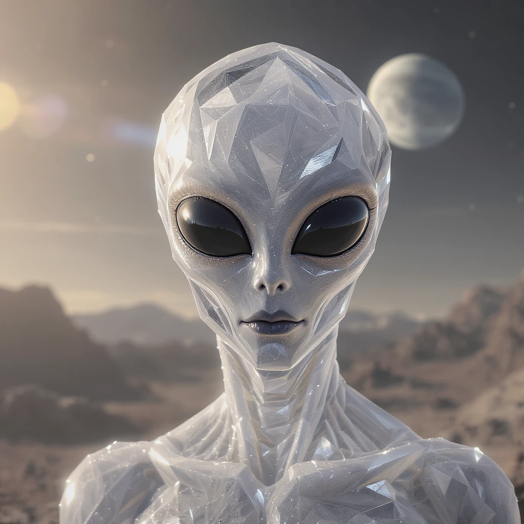 an alien made of crystal::2 big shiny black eyes, soulful eyes::planet in the background --v 4 --q 2 --ar 9:16