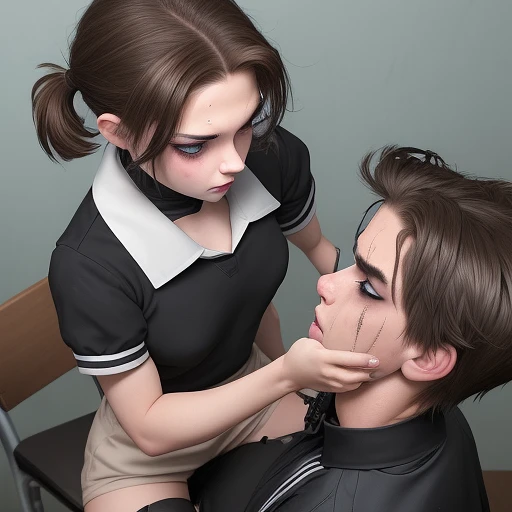 NSFW/ Photo of a ultra reasource_anime, slick combed back brown hair, sweaty, 1 girl, Smokey eyes, perfect make up, very detailed face, school outfit, 1boy, boy standing, girl sitting in a chair in front of a boy and grabbing his penis hard with both hands, brutal hand job, two handed hardcore handjob, messy handjob, open mouth, waiting for cum, ejaculating in her mouth, ejaculating penis, realistic jizzing, realistic cum, classroom, realistic, topless, huge natural rocket breasts, big stiff nipples, side view, Ultra details++ , add more details, listic sailing ship, dramatic light, pale sunrise, cinematic lighting, battered, low angle, trending on artstation, 4k, hyper realistic, focused, extreme details, unreal engine 5, cinematic, masterpiece, art by studio ghibli, intricate artwork by john william turner