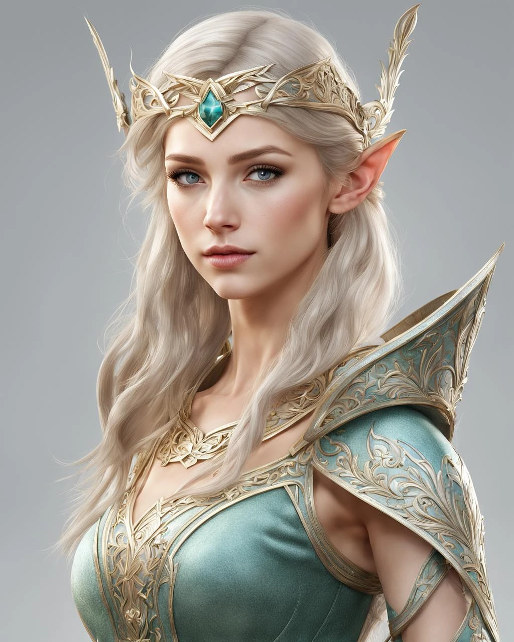full body portrait of female elf, perfectly in center, perfect face, perfect body, symmetrical photo, intricate, elegant, highly detailed, digital painting, concept art, smooth, sharp focus, illustration, octane render, photorealism, 3d model