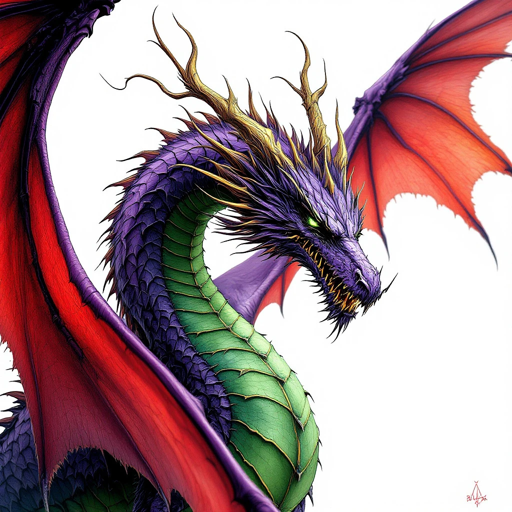 A magnificent Gothic Dragon Purple with Green and with Red wings with yellow veins in all of his glory