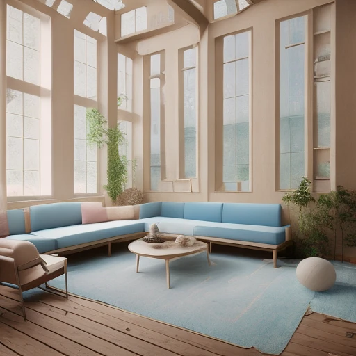 High resolution photography interior design, dreamy sunken living room conversation pit, wooden floor, small windows opening onto the garden, bauhaus furniture and decoration, high ceiling, beige blue salmon pastel palette, interior design magazine, cozy atmosphere; 8k, intricate detail, photorealistic, realistic light, wide angle, kinkfolk photography, A+D architecture