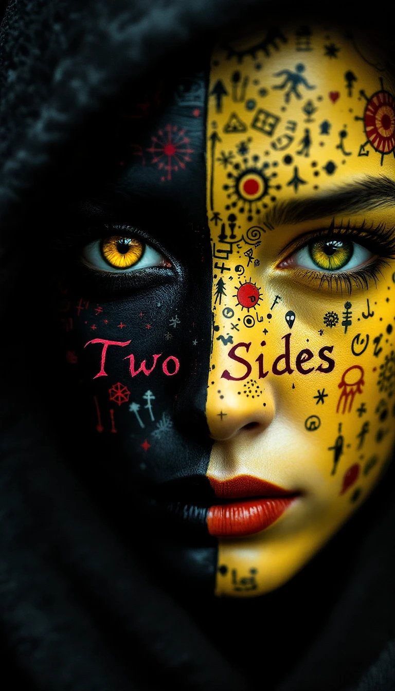 A close-up of a face adorned with intricate black and red patterns. The left side of the face is predominantly yellow, with symbols and doodles representing depression I, while the right side is dark, featuring symbols of manic mood people. The eye on the left is a striking shade of yellow, contrasting sharply with the surrounding patterns. The typography ‘Two Sides ‘ is written in bold character gothic font at the center. The face is partially covered by a hooded garment, cinematic_1940s cinematic_octane