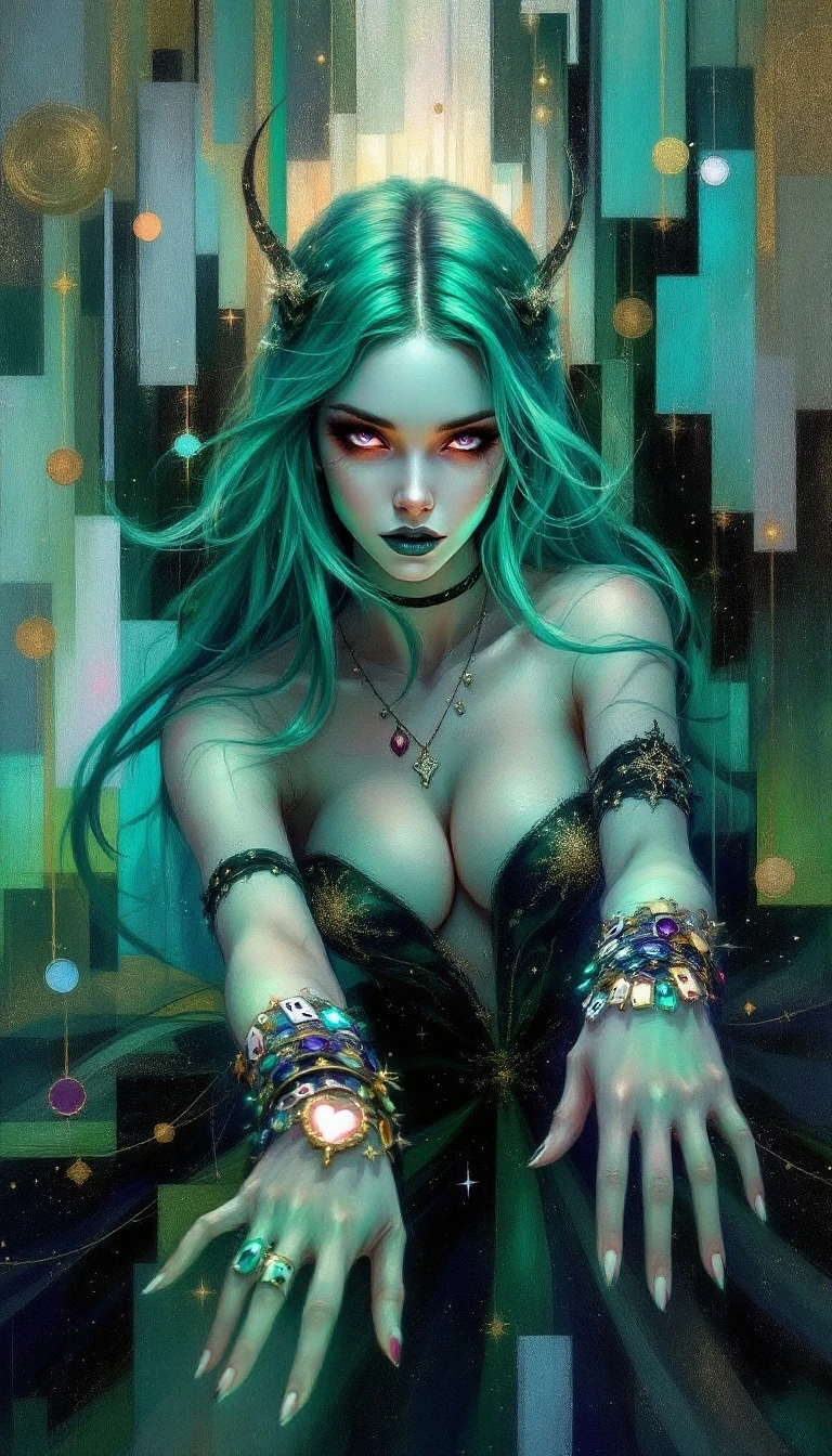 "Jade Illusionist in a Hall of Dreams": A captivating abstract painting captures an illusionist, displaying both elegance and a touch of mystery. She is a skilled performer, depicted in a grand hall of shifting patterns and lights, with a pale complexion, flowing jade-green hair that seems to move with an inner light, and an ornate gown with shimmering fabrics. Magical tools and playing cards are attached to her wrists and hands. The artwork masterfully blends modern abstraction with a figure study, creating an ethereal and captivating scene using colors such as greens, blues, and silvers. Her expressive, violet eyes, the composition's focal point, convey both a sense of magic and a powerful allure. After a night of performing illusions, the illusionist embodies both creativity and a sense of mystery. The dynamic forms and luminous colors invite the viewer to explore the untold tales within this vibrant piece, which is a painting.