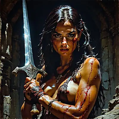 Combined art of Frank Frazetta, Boris Vallejo, Clyde Caldwell, Larry Elmore, Angus Mcbride, ultimate fantasy female, beautiful angry face with scars, exhausted and tired, holding sword. She has a short, bçack, messy hair, and she is grinning in anger, enraged --ar 4:5 --style raw --sref 54000006 5000005 --personalize sg4zsxs --stylize 950 --niji 6