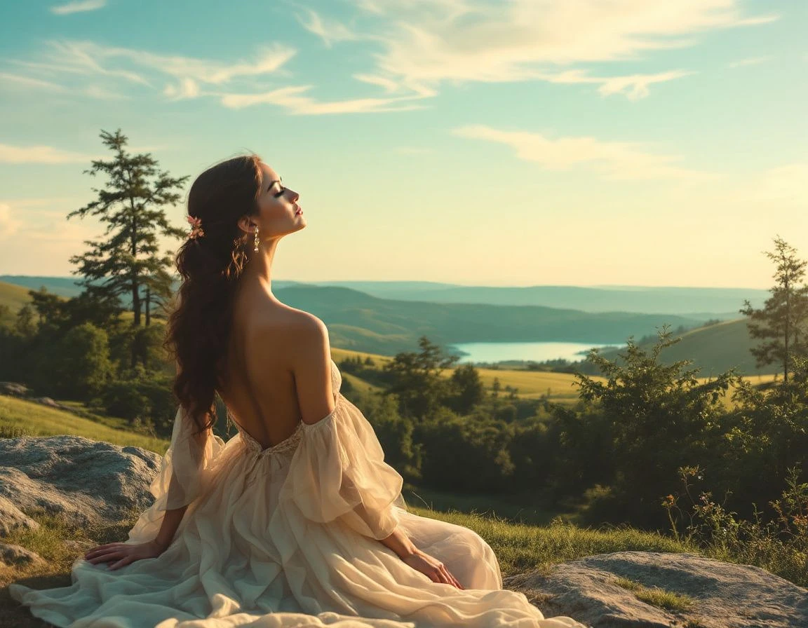 a picturesque landscape with rolling hills, trees, and a body of water in the distance. The sky is a soft, serene blue with wispy clouds, and the lighting is soft and diffused, with a warm glow that suggests a sunny day. The overall effect is one of peace and tranquility, with the woman's elegant pose and the serene natural setting combining to create a sense of calm and serenity.