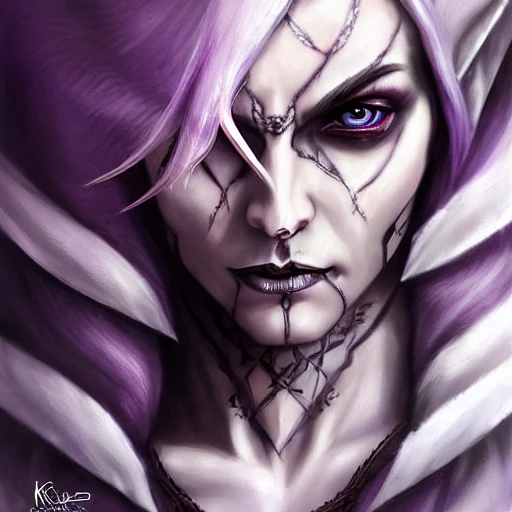 detailed portrait, shadar kai, female elf rogue, pointy ears, scar, tattood, mysterious, white hair, purple eyes, fine details, realistic shaded, face tattoos, dynamic pose, natural lighting, medium level shot, Mucha style , Grim fantasy, illustration , concept art,