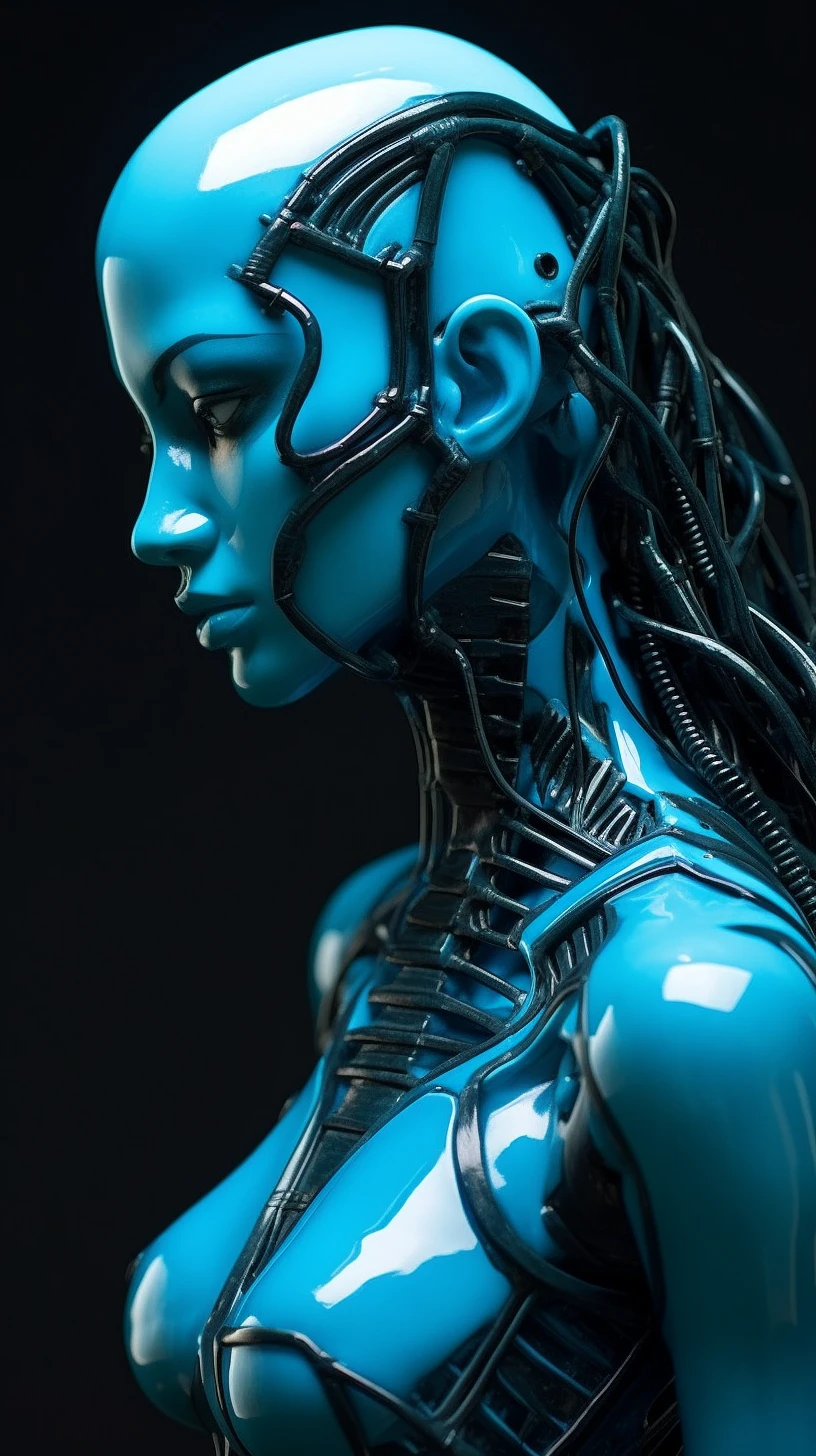 futuristic female in sci and tech, in the style of neon realism, dark cyan and light black, photorealistic detail, resin, smooth curves --ar 51:91 --style raw --s 750 --v 5. 1 -