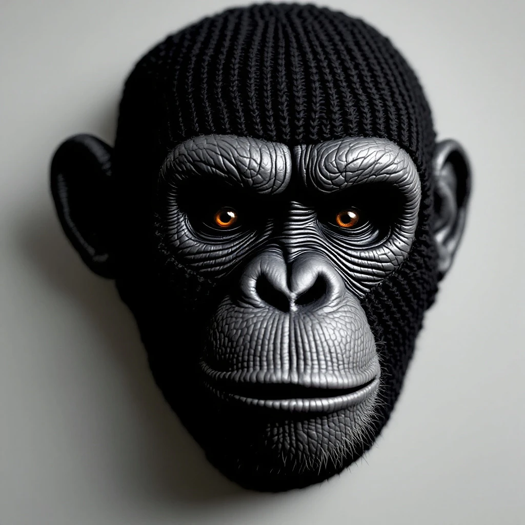 a black ribbed knit skimask, two holes for the eyes, one hole for the mouth, painted chimpface on it
