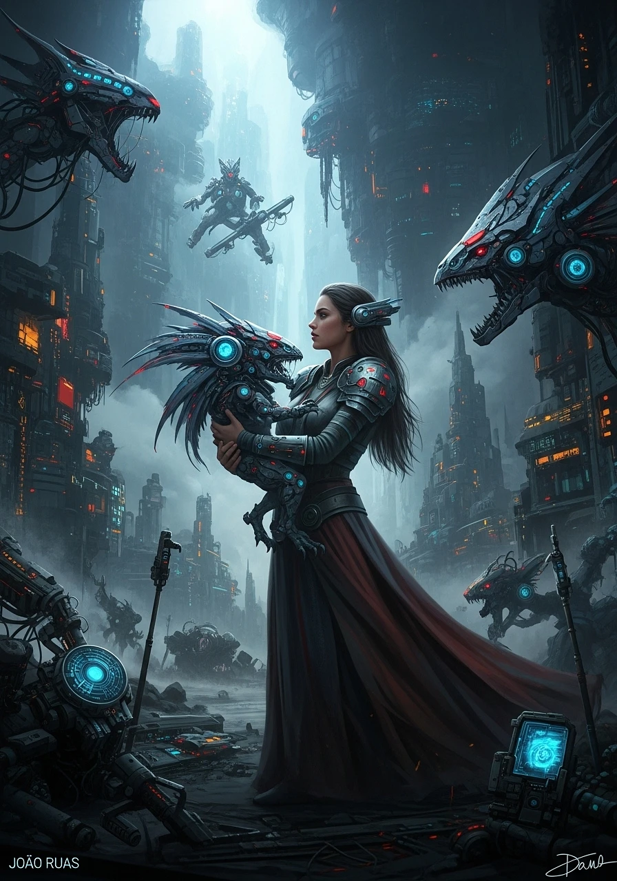 Produce a captivating and imaginative image in the artistic style of Joao Ruas. Depict a scene, with a woman holding a futuristic creature, highlighting the surreal and fantastical elements of the piece. The setting should convey a sense of advanced technology and dystopia, with details that bring this vision to life in a vivid and mesmerizing way. Capture the attention to detail and artistic mastery to create a stunning and futuristic image that embodies the essence of a captivating and surrealistic fantasy world. Epic cinematic dramatic dystopian futuristic scenario.