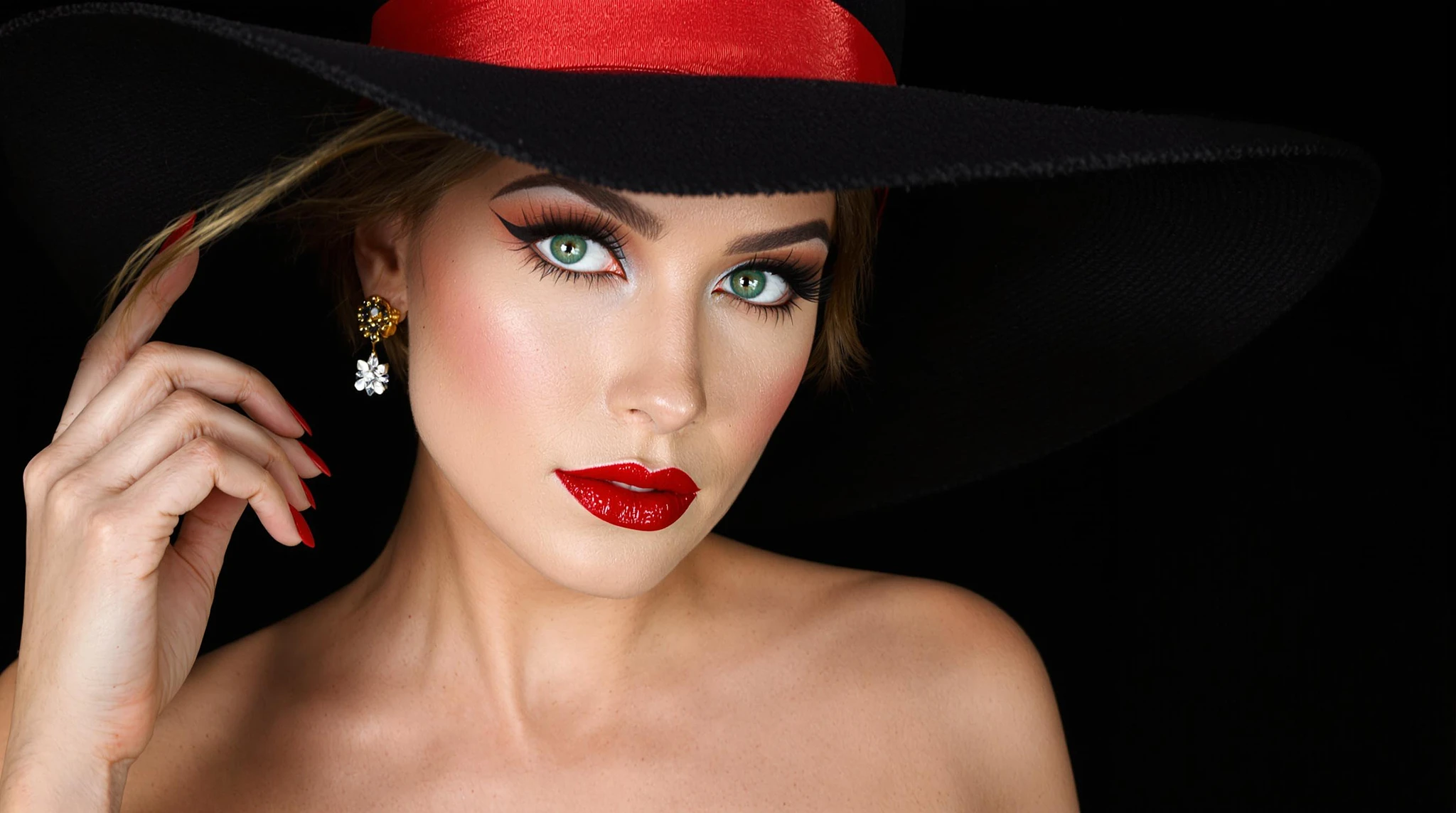 "Image is a high-resolution portrait photograph featuring a woman with a striking appearance. She has fair skin and is wearing a large, elegant dark black hat with a wide brim, accented by a bold red band. Her facial features are sharp and well-defined, with arched eyebrows and captivating emerald green eyes highlighted by dramatic black eyeliner. Her lips are painted a vivid red, matching her long, manicured nails. The lighting is soft yet focused, creating a contrast against the dark background, which enhances the subject's features and the vibrant colours of her makeup and accessories. The composition is centred, with the subject gazing directly at the viewer, exuding confidence and sophistication. "