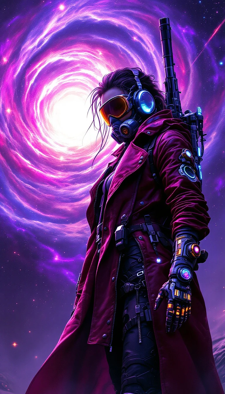 A space outlaw, clad in a detailed, crimson leather duster coat, stands against the backdrop of a swirling, violet nebula. She wields a customized plasma repeater, her cybernetic arm gleaming with embedded circuitry. High-tech goggles and a respirator complete her gear. The artwork showcases vivid colors, detailed textures, glowing elements, and dynamic composition, embodying a sci-fi western mashup. A breathtaking cosmic frontier, expertly illustrated with a steampunk aesthetic. Ultra-realistic 4K rendering in the style of Neo-Noir, neon ambiance, abstract black oil, intricate complexity, grunge, detailed acrylic, rendered in Unreal Engine, photorealistic.