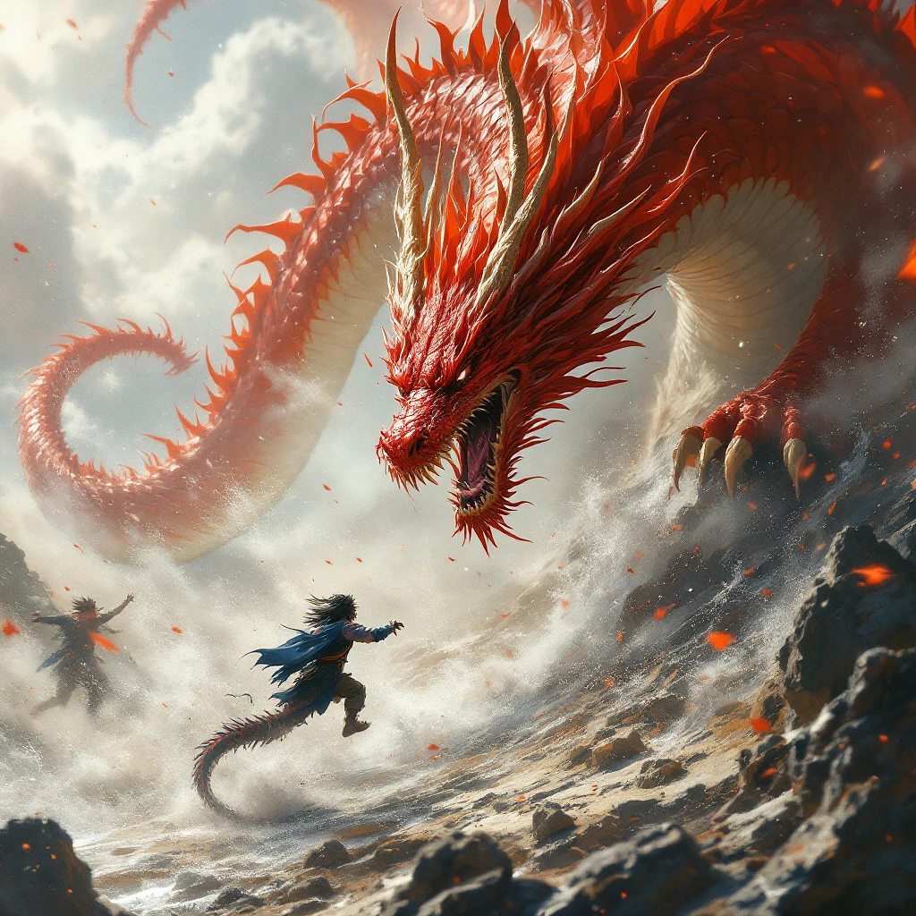 Dragon fight scene Quality: (Quality, 4k, High Definition, Masterpiece: 1.2) , Very Fine, (Fantasy Art, Oil: 1.5) Delicate Brushstrokes Composition: Bokeh, Composition, Powerful Sense of Motion, Dungeon Yon & Dragon inspired, overall amazing atmosphere of the scene, original composition, Dutch angle, animated performance. Story information: (((Red Dragon:1.2, Giant Monsters) )), a large dragon with red scales, fierce battles, speed.