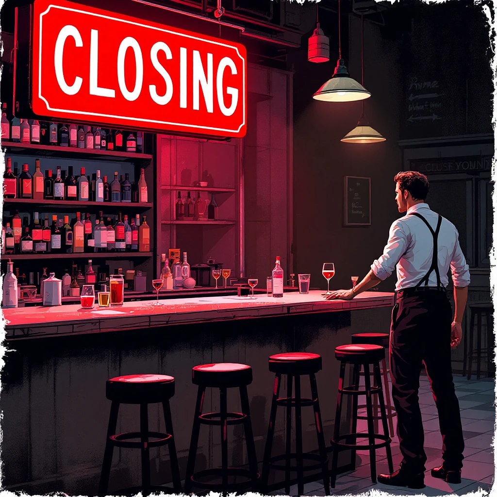 closing time at a bar, with a big exit sign lit up a bartender putting the stools upside down on tables.