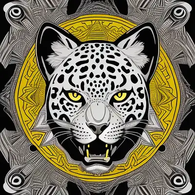 A detailed vector illustration of a jaguar head with symmetrical perspective, in the style of a tarot card, inked outline, in monochrome yellow tones