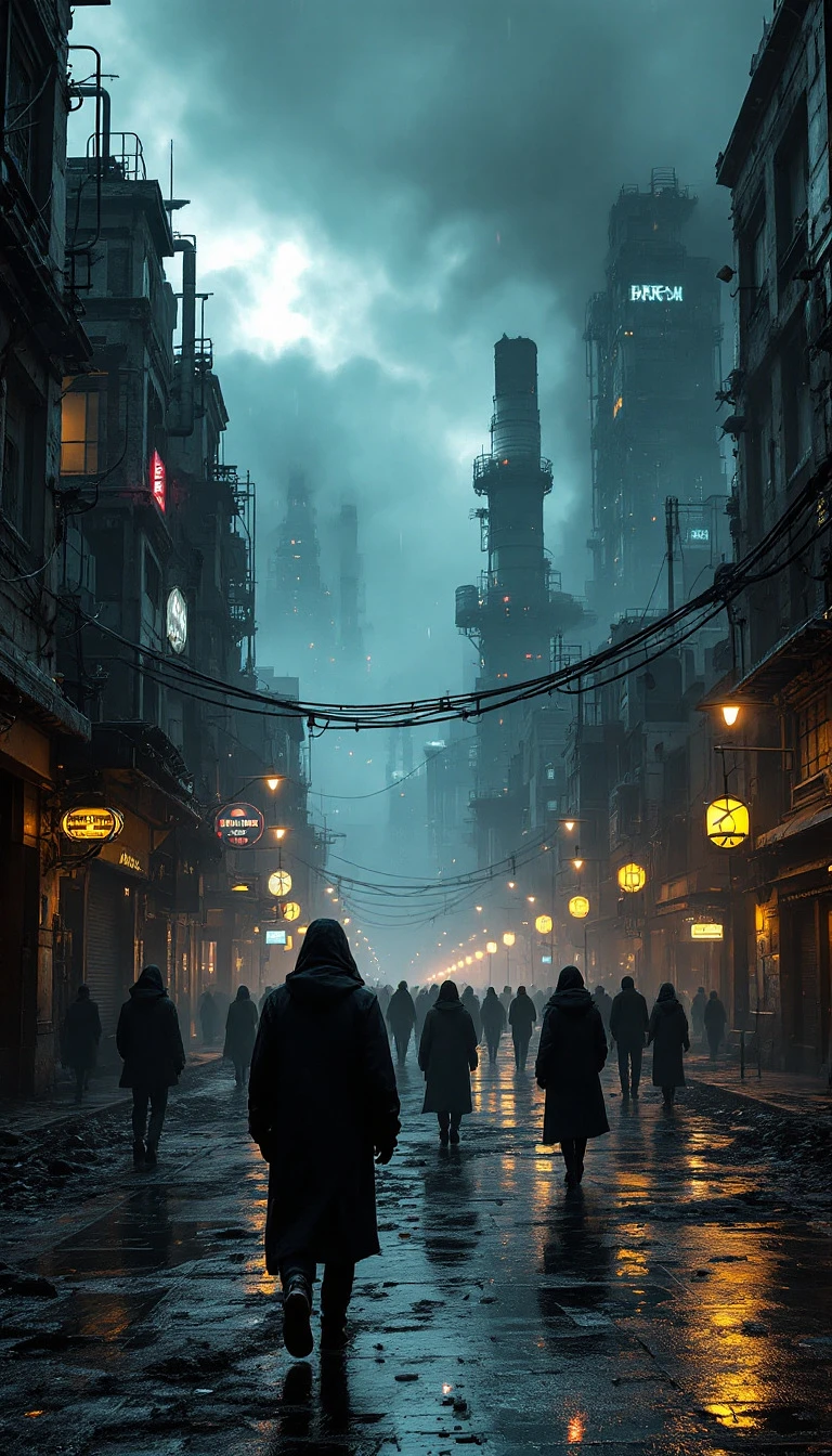 Hyperrealistic, hellish, dystopian, decaying buildings, futuristic street scene,   with a futuristic city and industry complexes, a sense of fog wafting in the surroundings, close up of people with lifeless empty gazes wandering aimlessly around, world has become a machine, life has become a machine, existence has no value anymore, night scene, after rain, wet streets, reflecting lights, neon lights, dark, mysterious, haunting, dramatic, ornate, detailed, 8K--v 4