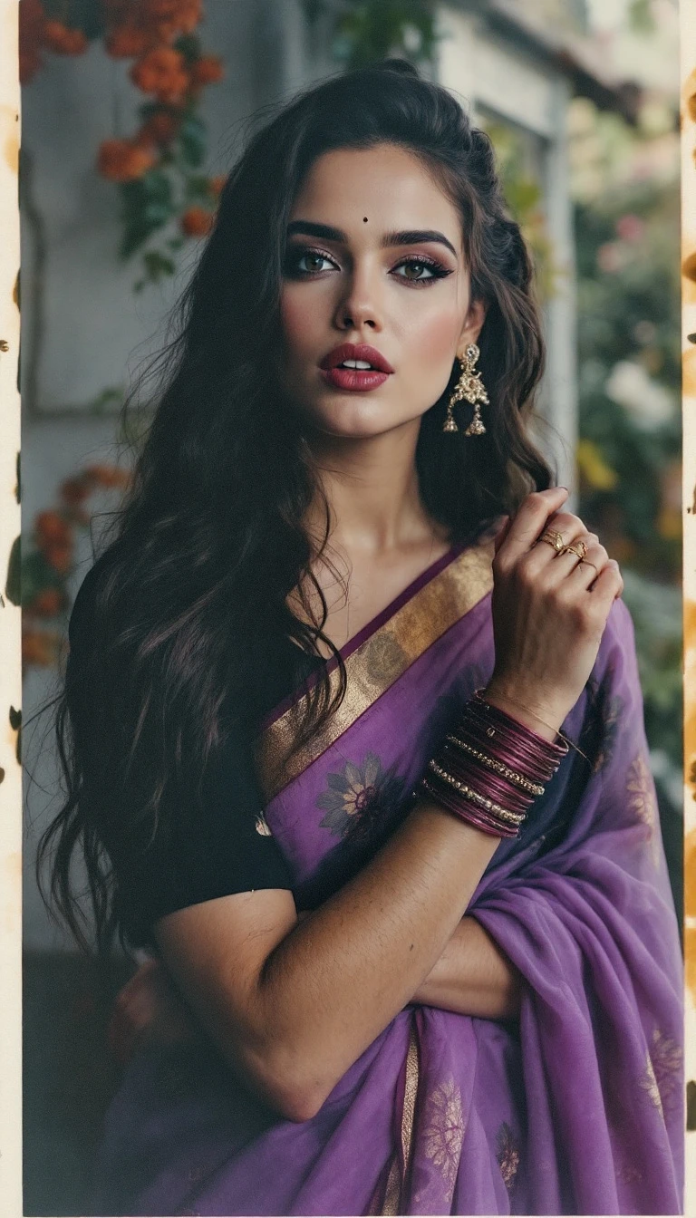 Polaroid camera, Hayley Atwell , 24-30 years old, Indian hair style, trying to love, inhaled chest, wide open eyes, A plus curvy shaped body structure, showing bangles on hand, bindi, high-quality photo portrait, environmental, double eyelid --ar 34:65 --style raw, indian ascent, flying kiss, feeling happy, beautiful legs, wearing violet transparent sari with black silk blouse, includes full body.