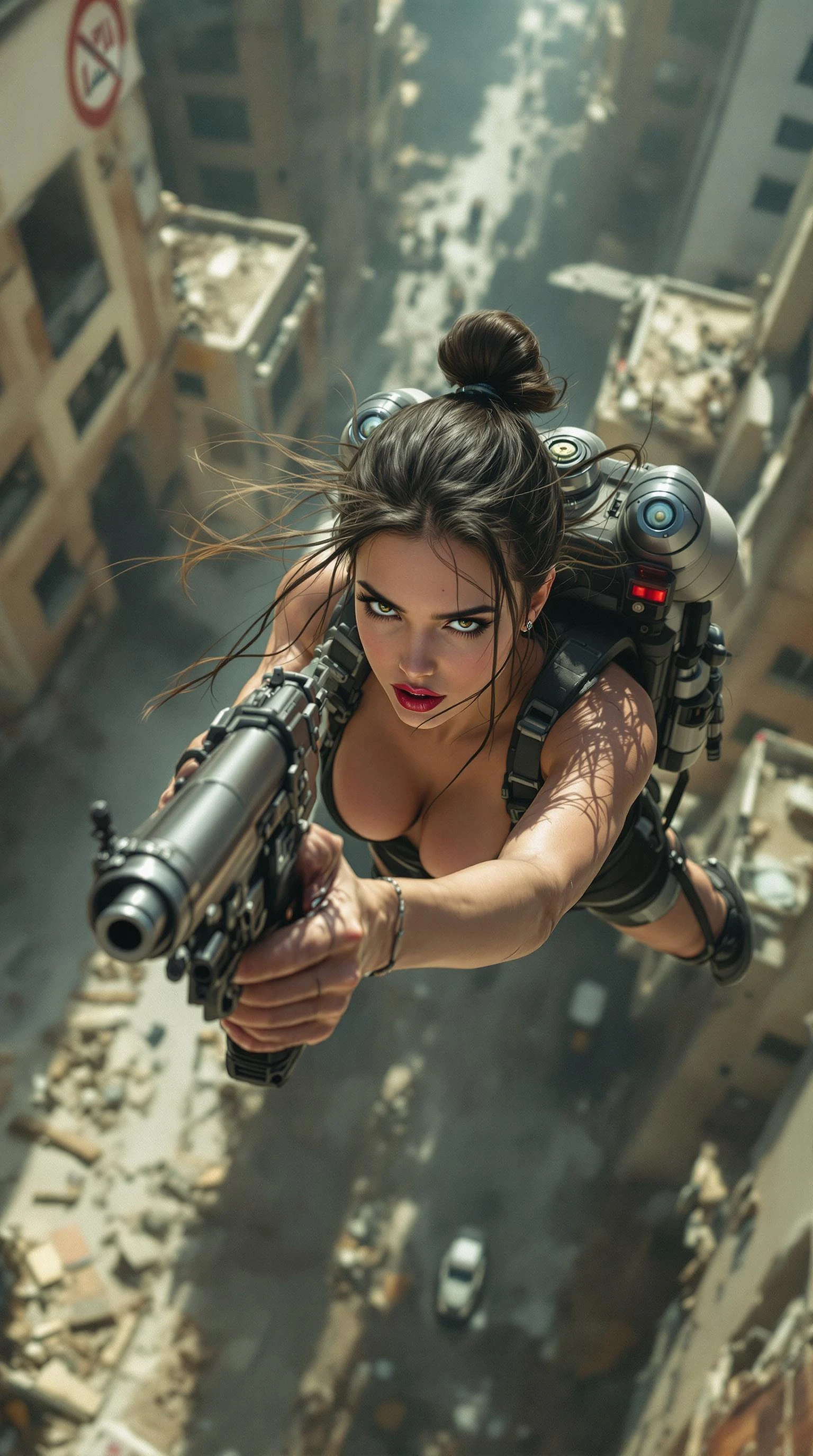 Fliegt auf die Kamera zu. ein schönes, aber schmutziges und zerlumptes junges, schlankes Mädchen, eine Kendall-Jenner-Doppelgängerin mit einer großen Waffe in den Händen, mit einem Jetpack auf dem Rücken, das auf die Kamera zufliegt, tief zwischen zerstörten postapokalyptischen Gebäuden auf Patrouille. Movie Scene. cinematic, postapokalyptischer Stil.
