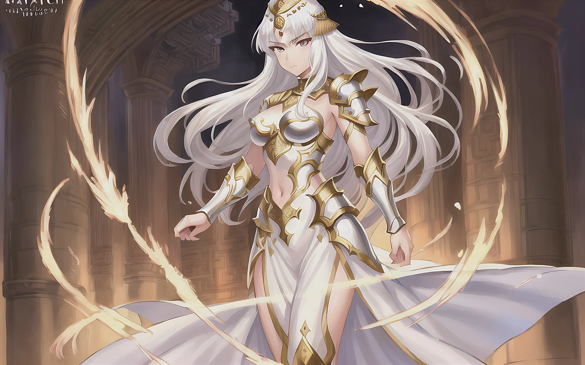 beautiful young asian girl warrior, detailed gorgeous face, beautiful eyes, full body, olive skin, medium length white hair, revealing armor, Hyperrealism, intricate, elegant, cinematic lighting, highly detailed, illustration, digital art, digital painting, masterpiece, breathtaking, raytracing, stunning environment