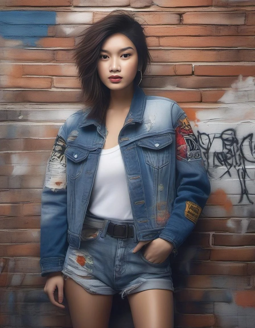 (masterpiece:1.3) , hyperrealistic rendering, high fashion illustration, Vogue magazine style, grunge style, (a woman:1.3) , (denim jacket:1.5) with patches, ripped jeans, (doc martens:1.2) , (bandana:1.1) , (confident pose:1.3) , urban background, brick wall, graffiti