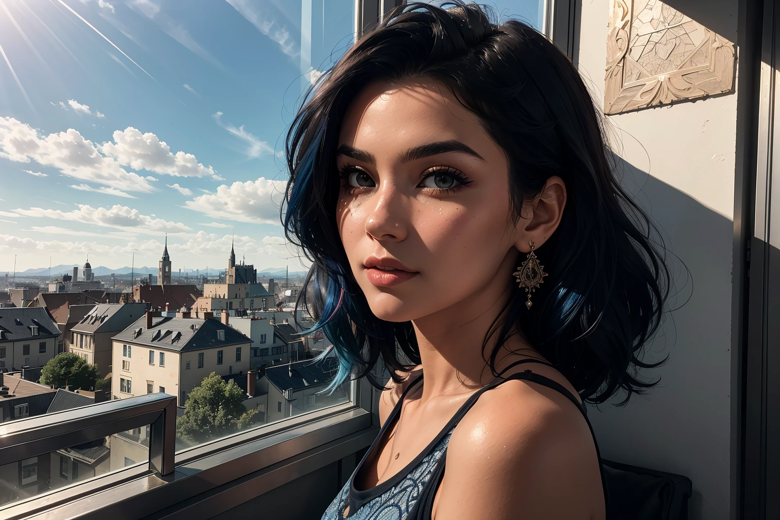 (best quality, masterpiece, perfect face, beautiful and aesthetic:1.2, colorful, dynamic angle, highest detailed face) , fashion photography of a european cute girl with long iridiscent blue hair, (blue tank top,detailed textures:1.2) , in a cafe , (intricate details, hyperdetailed:1.15) , detailed, sunlight passing through hair, (beautiful scenery in background) , (high contrast, extreme detailed, highest detailed) , HDR+