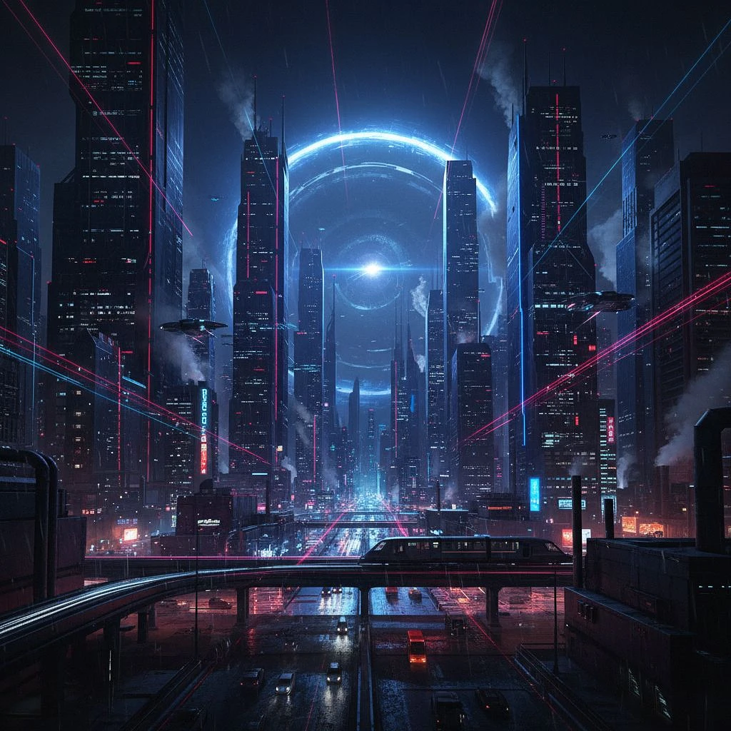 GIVE ME A BACKGROUND FOR A ICONIC SUPERHERO POSTER WITHOUT THE HERO, DARK MOODY BACKGROUND, FUTURISTIC, NIGHTLIGHTS, BACKLIGHTS,