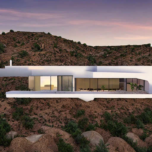 < Realistic architectural rendering, single-family home: white, modern, angular design, high on a steep cliff, in the desert of the American Southwest, stylish, generative design, warm color tones, realistic, cinematic, unreal engine, 8K, HD, volume sunset --ar 9:54