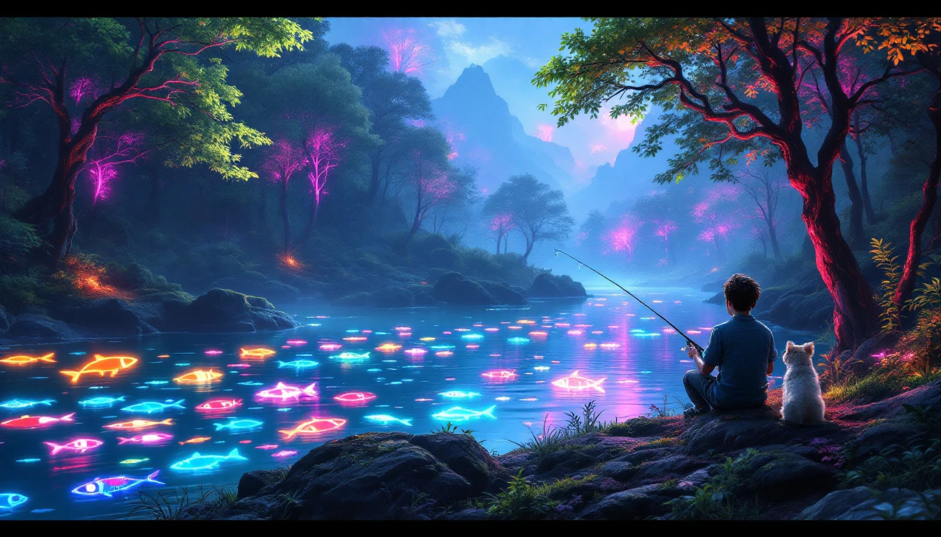 High resolution image of a neon forest and river where trees and river got integrated circuit theme. With a boy fishing and river is having neon fish of different shapes and size. Pet of boy which is a dog is sitting beside the boy. The image should be 8k, intricate detail, wide angle, fictional lights, cinematic depth of field.
