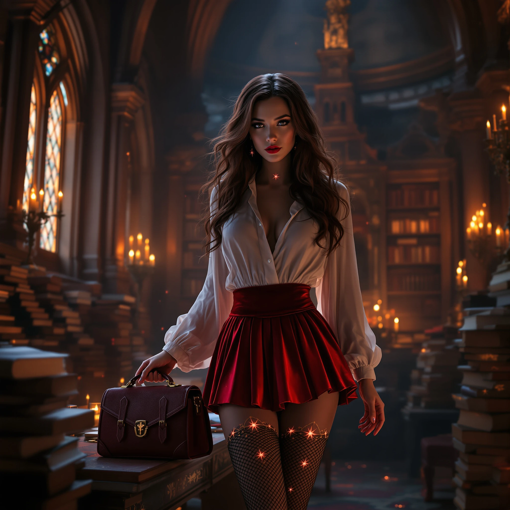 Scarlet Witch – University Library A mystical cinematic scene of Scarlet Witch inside the candlelit university library. She wears an ultra-short crimson pleated skirt with velvet trim showing off her toned legs, a white blouse with flowing sleeves, she has an aura of red energy. Stockings patterned faintly with mystical symbols shimmer in the warm light. Her satchel rests open on a table, glowing softly with scarlet energy. Stacks of ancient books tower around her, the warm candlelight flickering against gothic windows. Hyper-detailed, dramatic cinematic lighting, enchanted atmosphere.