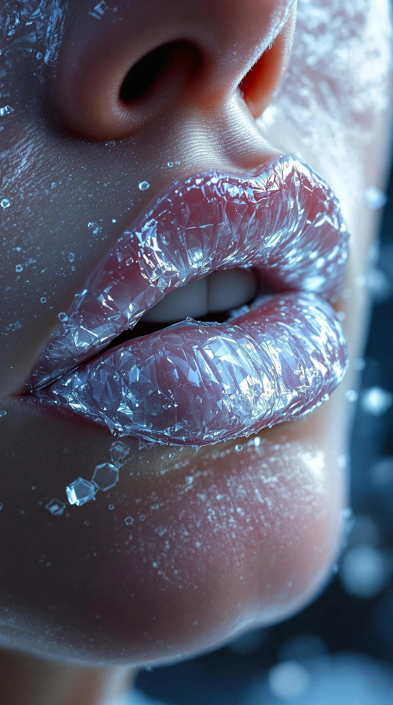 Ultra- realistic image: the skin of women's lips as frozen ice. The surface and structure of the lips look as if they were made of frozen ice. The lips should have a texture that is as close as possible to Ice.