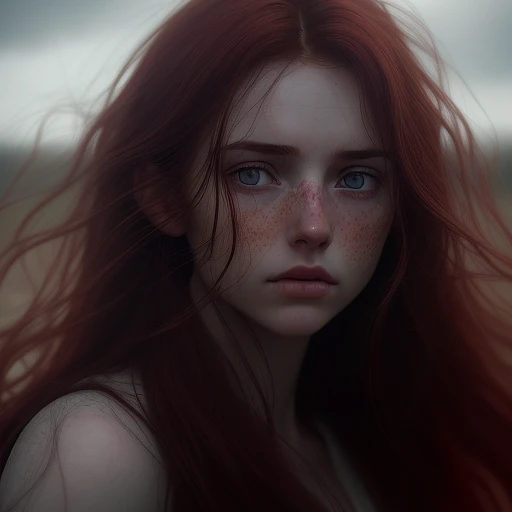 Close-up photo of a beautiful Irish girl, adorable face, red long layered hair, no makeup, realistic skin texture, low saturation, dark tone, inspired by Alessio Albi, f1. 4, 85mm lens, hyper realistic , lifelike texture, dramatic lighting, professional shot, heavy shadows, dynamic pose, innocent look