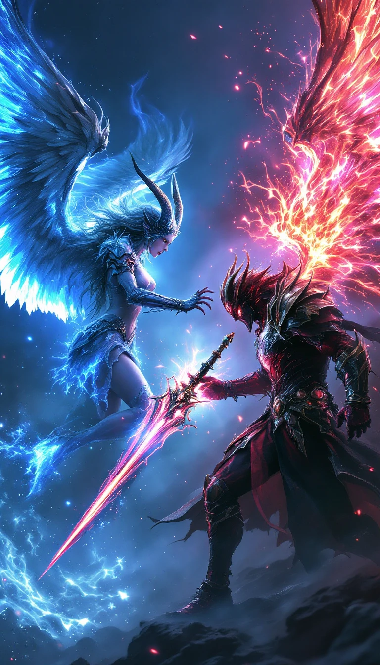 hell and heaven fight, demon male vs female angel war, fantasy game, in extrem epic fantasy armor withe many accessories and detailles. Many glowing things, fantasy, 4k, ultra quality, epic, fantasy, mmorpg, mystic background mix of hell and heaven
