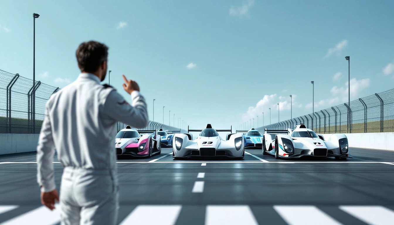 There are 5 racing cars at the starting line. A man in a white coaching uniform stands at the side of the cars. A man whistles and waves a flag. The camera looks from the other side of the road, in front and slightly above, at 5 racing cars standing on the track at the starting line and at a man with a flag, facing towards the camera and cars Style - cyberpunk