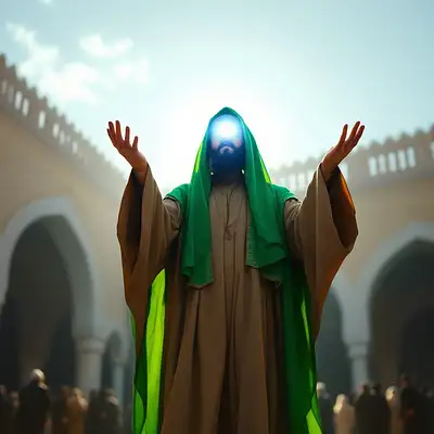 Close Shot - Eye-Level - Compassionate Gesture English: Imam Ali’s hand, in a long light brown robe with wide sleeves and a green shawl over his head, gently hands a coin to a poor man in a quiet corner of Kufa. A white light covers his face, radiating to his hand. Details: Worn hands of the beggar, green shawl peeks into frame, soft light highlights his kindness.