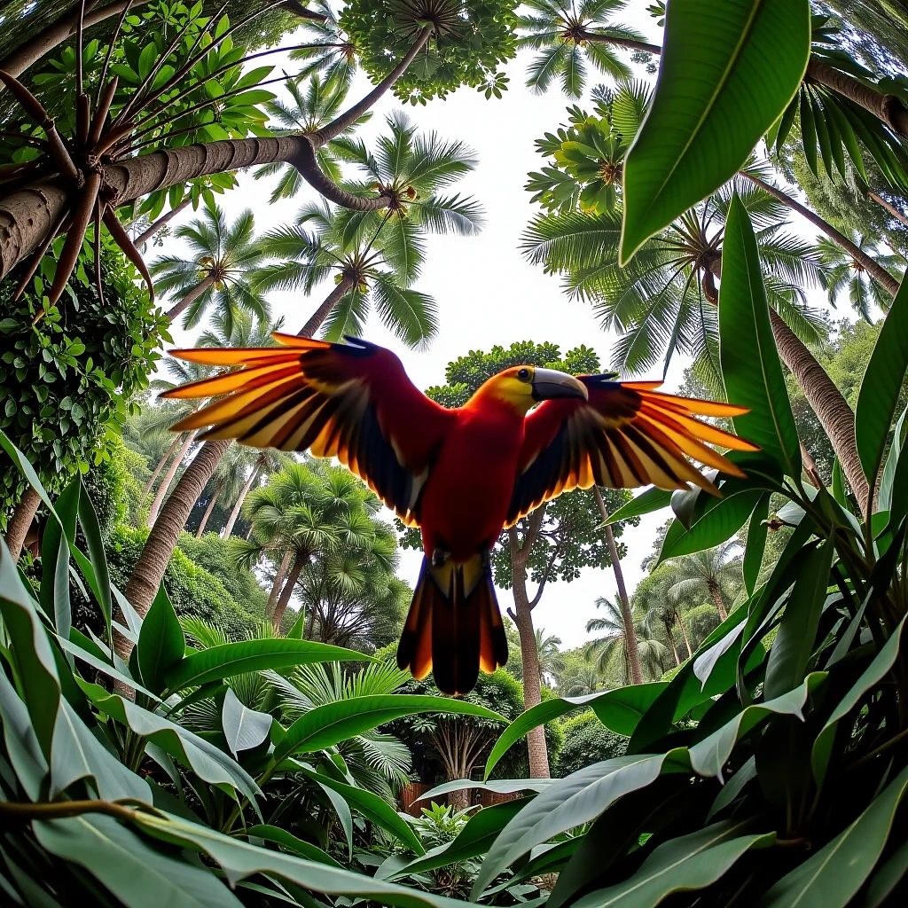 Fisheye lens view of a dense rainforest canopy with vivid tropical birds mid-flight, perspective warped in all directions​​​