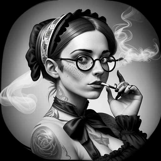 High resolution photography detailed black and white photo of an attractive victorian steampunk woman with freckles, wearing large round glasses, a bandana on her head, tattoos all over her face, smoking a cigarette, looking straight ahead, in the style of old school tattoo art --ar 73:105 --stylize 750