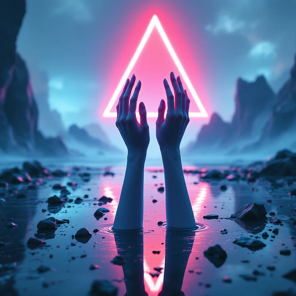 Two anatomically perfect hands, slender and feminine, emerge from a sleek, reflective cyberpunk ground. Each hand features five delicate fingers with elegant, slightly elongated proportions. The fingers are stretched upward in a gesture that conveys longing and transcendence. The perspective shows the hands from behind, with the palms facing away and the smooth backs of the hands and fingers prominently visible. The skin of the hands glows faintly with a neon blue hue, accentuating the intricate details of knuckles, tendons, and the subtle texture of human skin. The ground beneath the hands is a highly polished, mirror-like surface interspersed with scattered reflective stones and shards that catch and refract the neon lights from the environment. The reflections of the hands and surrounding elements create a mesmerizing interplay of light and texture. The background is a vast cyberpunk landscape, dominated by a glowing, otherworldly portal—a massive, luminous triangle suspended in the air. The object radiates a pulsating, ethereal red and orange glow, casting dynamic highlights and shadows across the scene. This glow interacts with the hands and ground, creating vibrant reflections and atmospheric depth. Surrounding the orb are faintly visible futuristic structures and jagged silhouettes, blending darksynth and synthwave aesthetics. Dramatic lighting enhances the scene, with volumetric light beams cutting through a haze of suspended dust particles. The air is thick with a surreal, ink-cloud-like atmosphere inspired by the fluid, chaotic beauty of Alberto Seveso’s art. The environment feels alive, with subtle ripples in the reflective ground and flickers of light dancing across its surface. In the distance, a grim, skeletal figure resembling a reaper from space looms faintly, its glowing dead eyes barely visible through the haze, adding an ominous undertone to the scene. The overall aesthetic is reminiscent of an 80s retro movie poster, combining cinematic lighting, intricate detail, and dramatic contrasts. Rendered in 8K with Octane, the image captures the essence of darkwave and synthwave, evoking both beauty and existential dread. The composition is highly detailed and immersive, designed as an epic music album cover symbolizing humanity's downfall and the ascension of artificial intelligence. The reflective ground, intricate anatomy of the hands, glowing orb, and cyberpunk details create a visual masterpiece, perfect for conveying a story of despair and transformation. magic from outer space, mid 80s vhs art