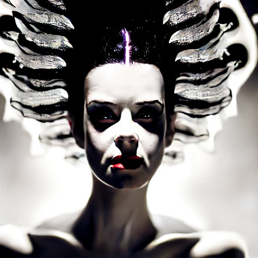 a very beautiful bride of frankenstein, long black hair with white streak, full body portrait, beautiful white flowy dress, old horror movie, cinematic lighting, hyperdetailed, 8 k realistic, symmetrical, global illumination, trending on art station, dim lighting, yellow glow backlighting, digital art, highly realistic photography, very very very beautiful face