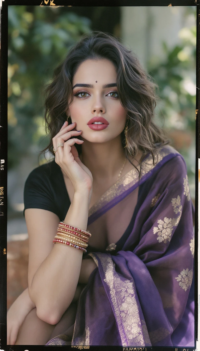 Polaroid camera, Hayley Atwell , 24-30 years old, Indian hair style, trying to love, inhaled chest, wide open eyes, A plus curvy shaped body structure, showing bangles on hand, bindi, high-quality photo portrait, environmental, double eyelid --ar 34:65 --style raw, indian ascent, flying kiss, feeling happy, beautiful legs, wearing violet transparent sari with black silk blouse, includes full body.