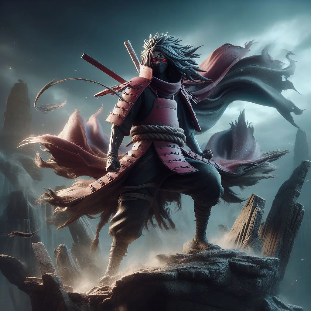 In a mystical, war-torn landscape, Madara, the legendary, powerful ninja, stands triumphantly atop a crumbling, ancient ruin, his cloak billowing dramatically in the wind. The artistic 3D portrait captures every intricate, photorealistic detail, as the masterful use of volumetric lighting, reflection, and texture mapping brings the imposing, charismatic figure to life. The atmospheric, battle-scarred environment, the striking, realistic facial features, and the dynamic, lifelike pose showcase Madara's dominance, elegance, and unmatched power, immortalizing the iconic character in a visually stunning, breathtaking tribute.