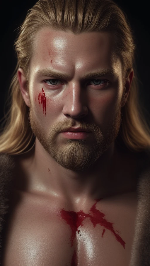close-up photo of handsome viking king in a fight, blood on his face RAW photo, masterpiece, The Cinestill hasselblad 85 mm camera has a wide shot portrait of a (gorgeous face:1. 2) , looking at camera, Glamour Shoot, Golden Ratio, Photorealistic, ultra realistic, Hyperrealistic, Hyperdetailed, analog style, detailed skin, matte skin, soft lighting, subsurface scattering, realistic, heavy shadow, masterpiece, best quality, ultra realistic, Intricate, High Detail, (soft focus) , (high detailed face:1. 2) , (high detailed skin:1. 2) , 8k uhd, dslr, high quality, film grain