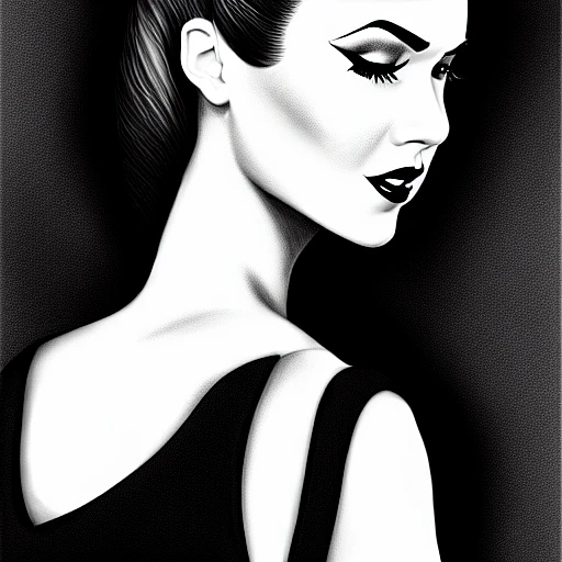beautiful woman pinup, black and white in the style of alex ross, wearing a tight black dress, black hair ponytail, 2 d, 4 k, unreal, intricate, digital painting, highly detailed, artstation, sharp focus, illustration, half body