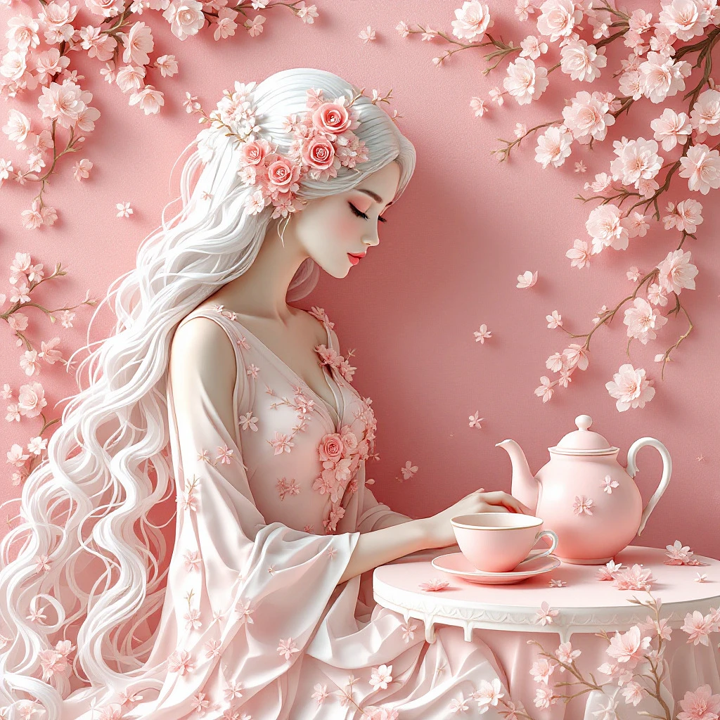 A dreamy fantasy scene in the style of paper quilling and high relief art. A graceful woman with long white hair adorned with blossoms, wearing a flowing white dress decorated with roses in high relief. She sits beside a delicate pink porcelain teapot and teacup on a table, surrounded by cherry blossoms. The background is a pink wall with paper cutout textures, floral decorations, and soft fantasy atmosphere. Elegant, detailed, ethereal, ultra-high quality, 3D paper quilling effect. in the style of Paper quilling --niji 6