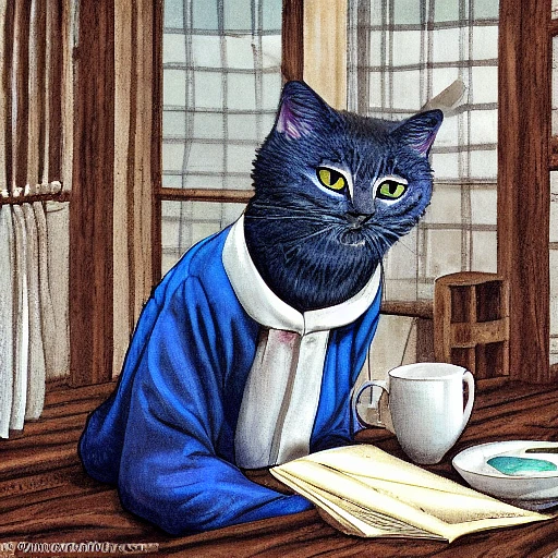Anthropomorphic blue British short haired cat, dressed in robes, eating breakfast, reading newspapers, lighting rooms, movies, HDR, primitive, complex, high-quality, soothing tones, complex details, low contrast