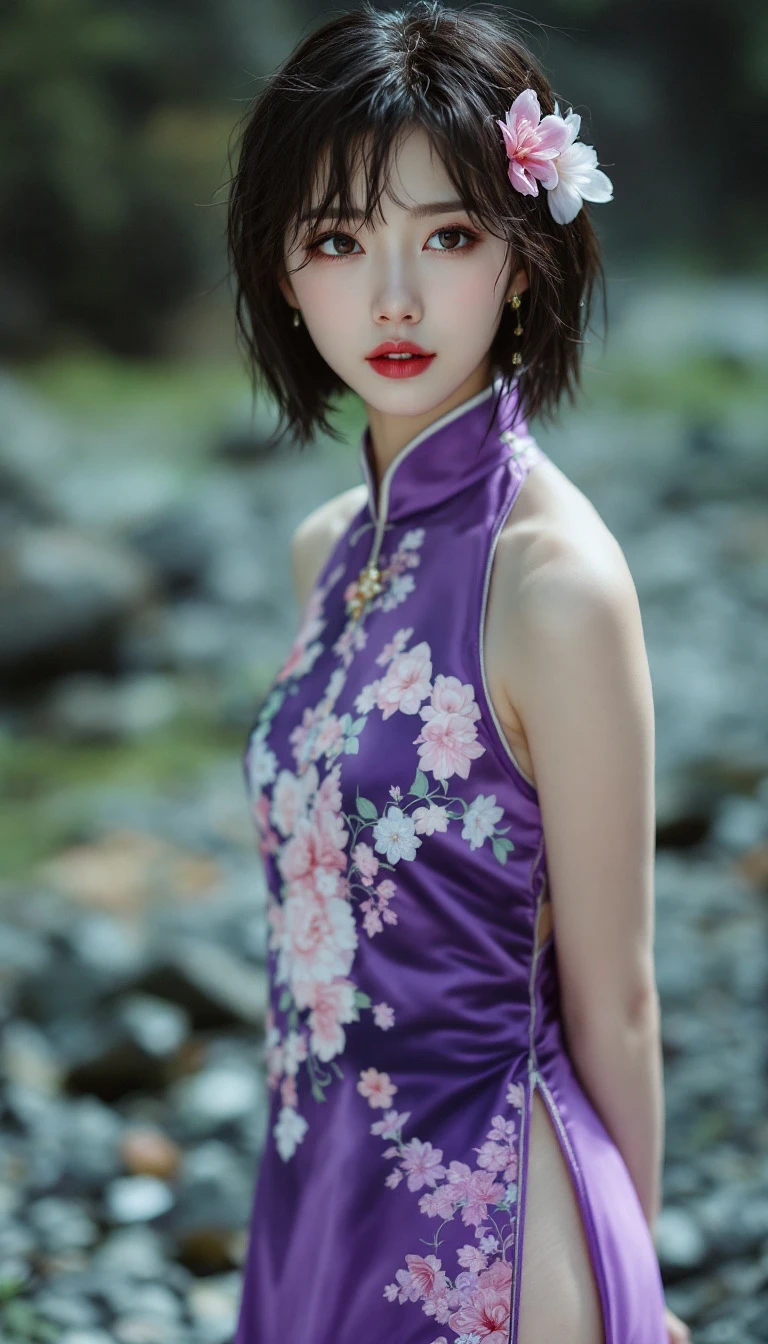 Full body view full body shot full-length portrait of a asian beauty barefoot woman, arm behind, cute face, model, wet short hair, flower in hair, messy hair, bob cut hair, intense black hair, highly detailed eyes, beautiful colored eyes, fit body, short purple Chinese cheongsam, barefoot, ornament for hair, jewelry, cinematic, more details: 1. 3. stand up on land of small sharp stones
