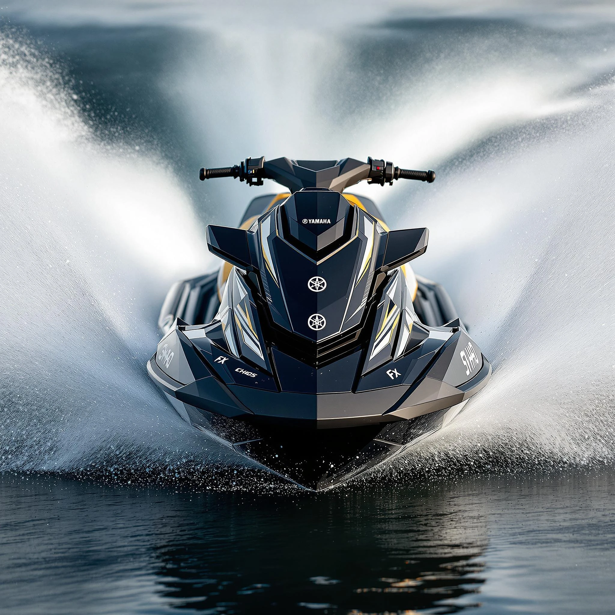 photography, sports shooting, dynamic range, dynamic motion with yamaha fx svho jetski black in color with a chaos logo on the front heading straight at camera