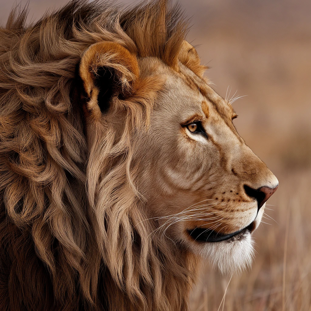 3d photorealistic photo, side profile of a lion on the Serengeti, extreme close-up, in the style of Frans Lanting, shot on a Canon EOS R3 with a 70-200mm lens, filling the entire screen, high-resolution --ar 1:2 --stylize 750