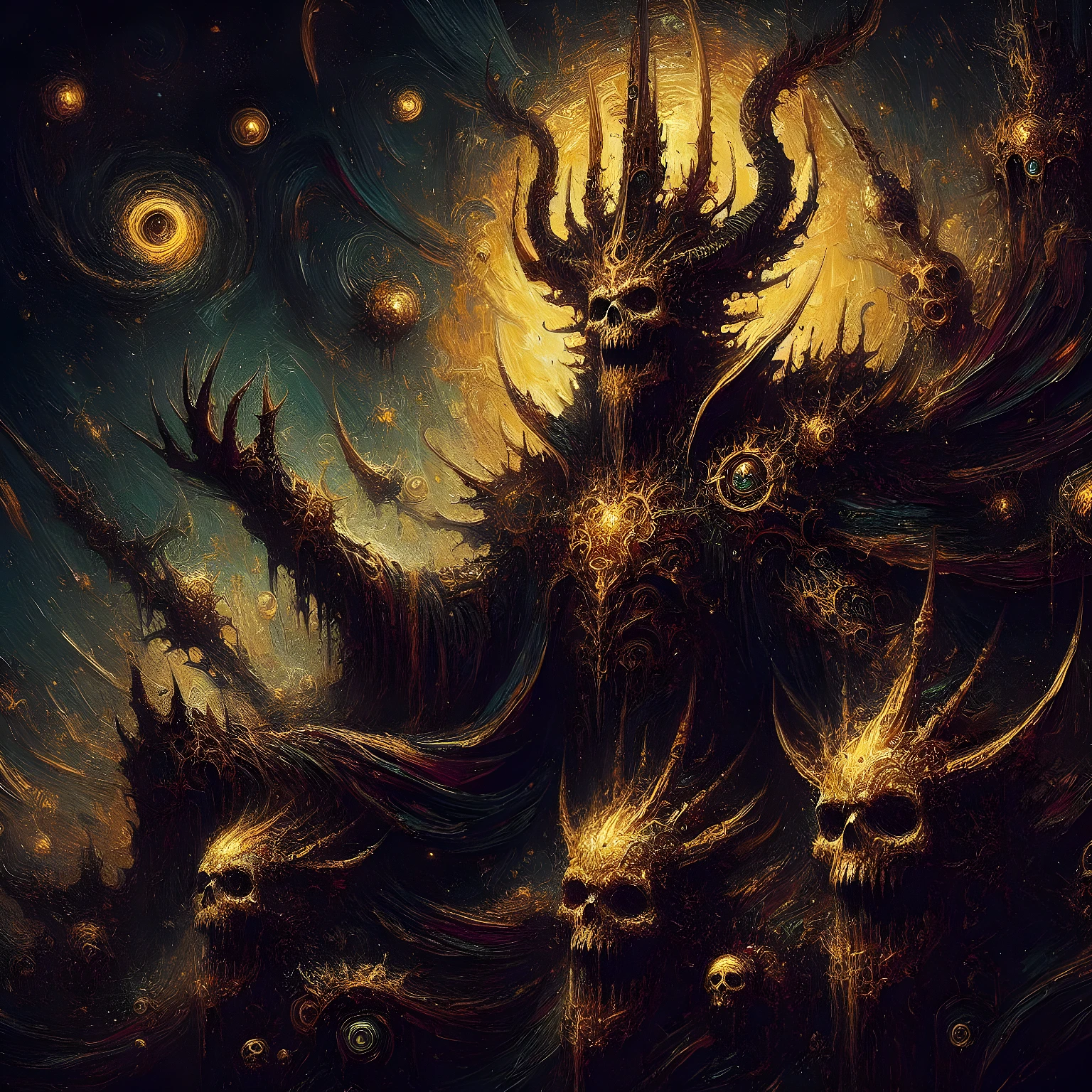 chaos King, Acrylic paint or oil paint on canvas, Physical medium, Contemporary era, Dark hues with highlights in gold or yellow.